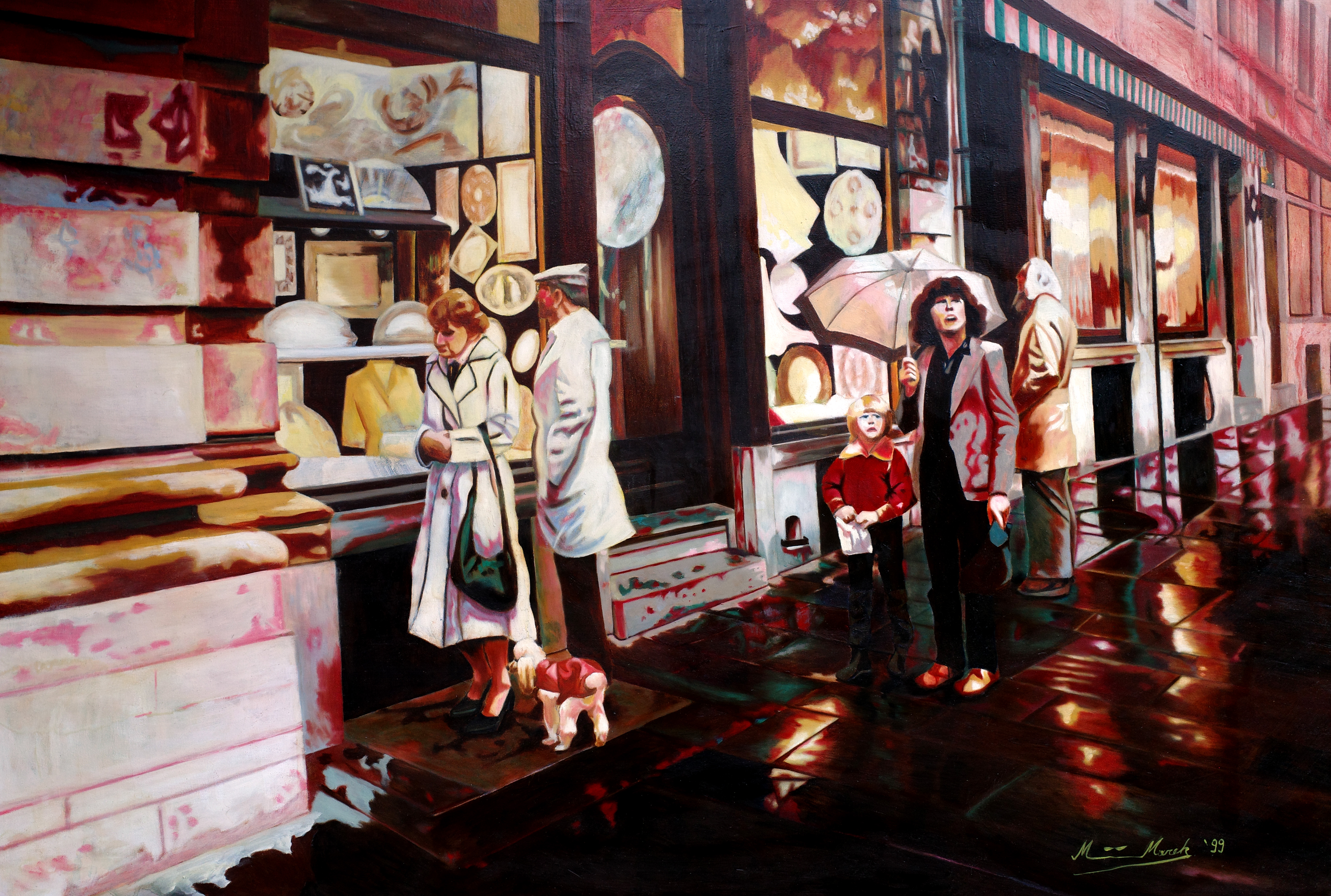 Als uitgangspunt gebruikte ik een foto van mijn vader, die van beroep fotograaf was. Hier zie je mij als kind met mijn moeder op een regenachtige dag op de grote markt van Brussel, voor de typische kantwinkeltjes. De scéne kon niet meer Belgisch zijn. De lichten van de winkels weerspiegelen op de natte stoeptegels. Het schilderij is groot van formaat, namelijk 100 cm op 150 cm. Nog steeds heb ik een voorliefde voor dergelijke onverkoopbare grote formaten, :))